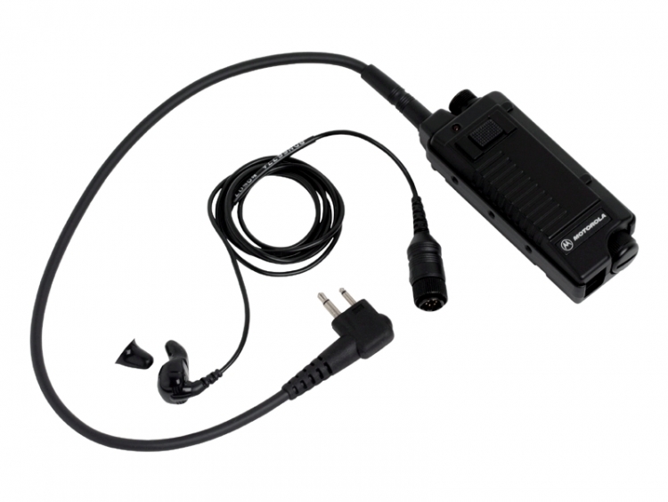 Motorola BDN6646 (Bone Inductive Ear Microphone with PTT Interface) - гарнитура скрытого ношения системы Voiceducer основанная на принципе передачи вибрации голоса по костям черепа, гарнитура отличается исполнением микрофона и наушника в одном компактном корпусе вставляющемся в ухо аналогично наушнику плеера, кнопка PTT и активации VOX вынесены на модуль управления гарнитуры.
