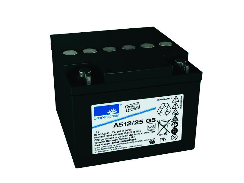 Sonnenschein A512/25 G5 -произведена по технологии dryfit (гелеобразный электролит),стационарная, свинцово-кислотная, герметизированная, необслуживаемая. Отличная герметичность позволяет аккумулятору работать при сильных кренах и в горизонтальном положении, без утечки электролита. Аккумуляторы Sonnenschein серии А500 используются в различных областях: источники бесперебойного питания (UPS), системы безопасности и сигнализации, связь и телекоммуникация, транспорт, медицинское оборудование и т.д.