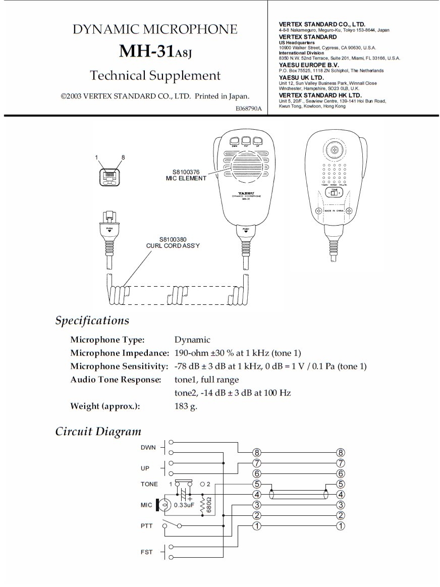 A06870001 / Yaesu Vertex Standard MH-31A8J динамический микрофон-тангента для радиолюбительских трансиверов компании Yaesu и профессиональных КВ радиостанций марки Vertex Standard. Микрофон MH-31A8J оснащен тремя функциональными кнопками, двухпозиционным регулятором чувствительности микрофона на тыльной стороне корпуса и съемным витым кабелем.